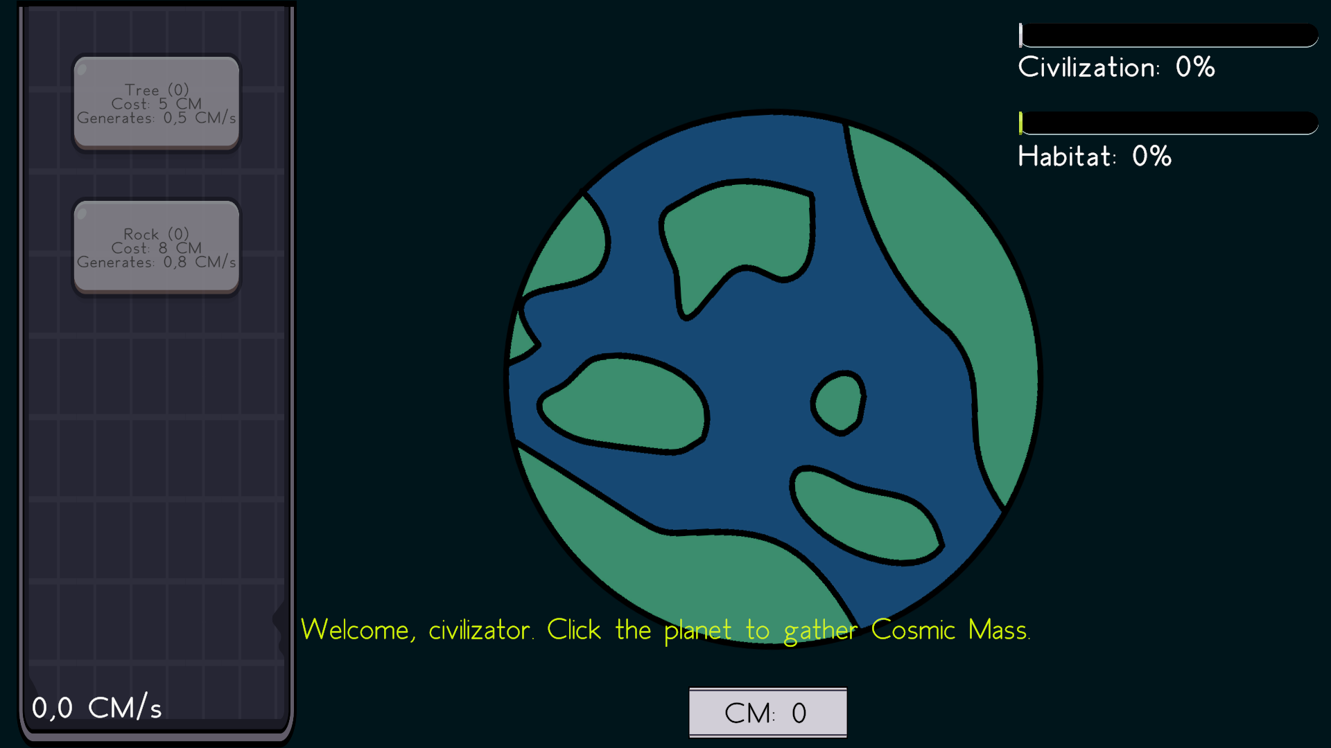 As a God, you harness "Cosmic Mass" to seed forests, create water, and terraform a desolate rock into a living paradise. As an Astronaut, you descend to the surface to gather resources, survive the elements, and build the foundations of a new civilization. Your goal is to reach 100% Harmony and Civilization without letting your world slide into Crisis.